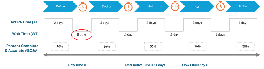 Wait Time between the Define and Refine states in their workflow. They used the 5 Whys in the previous step in the VSM process to identify that training on better backlog management and refinement is needed to address the root cause of this bottleneck. The good news is the team has complete control over this bottleneck since they can improve how they write and refine their stories.